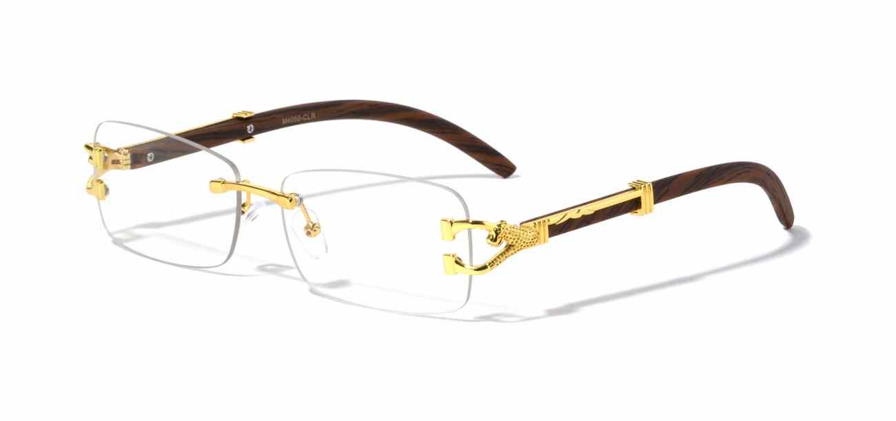 Enhance your eyewear inventory with Rimless Clear Lens Rectangle Glasses featuring Jaguar hinge accents and wood-pattern temples, designed with a sleek rimless silhouette, lightweight comfort, and clear lenses. These fashion-forward glasses offer premium detailing, modern elegance, and versatile appeal, ideal for retailers targeting customers seeking stylish, non-prescription eyewear for everyday and professional wear.