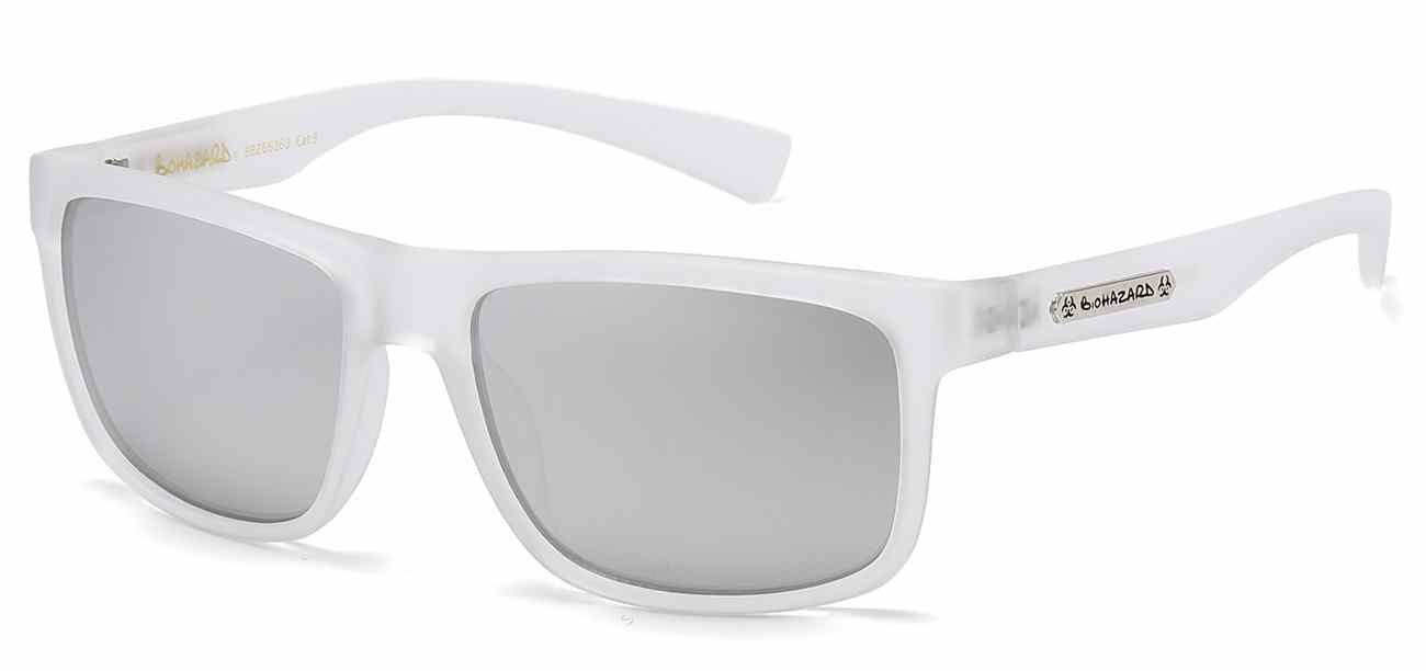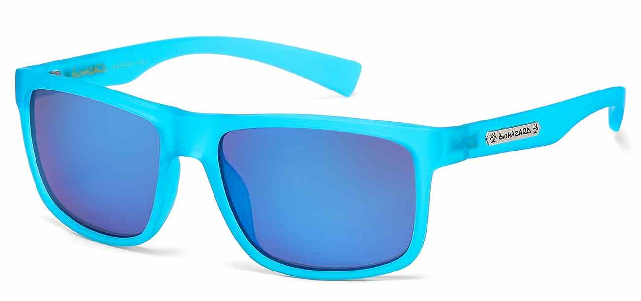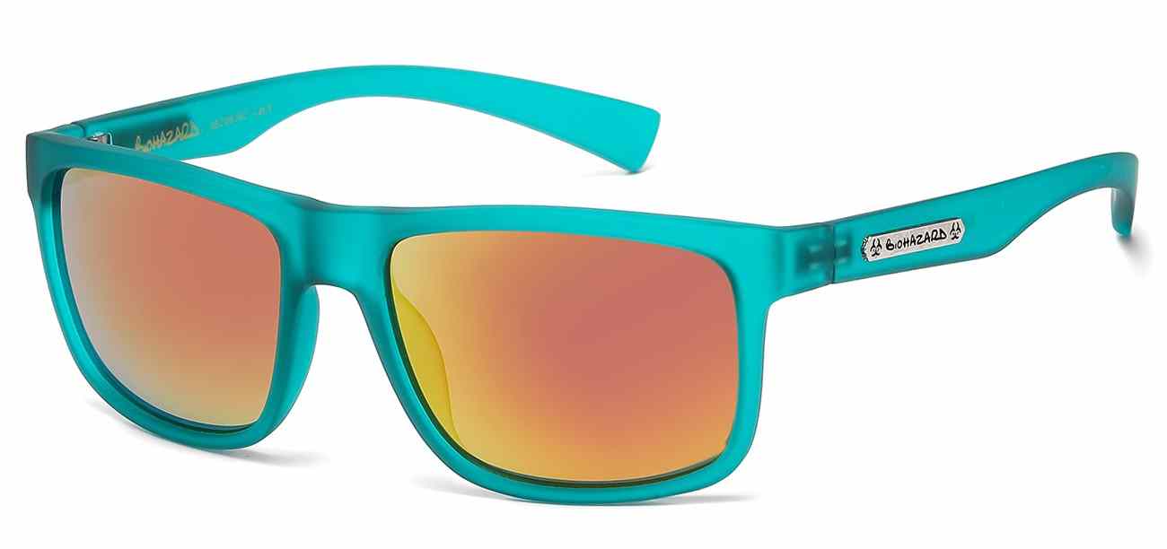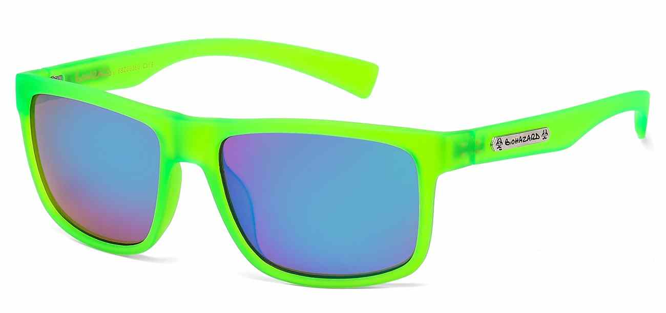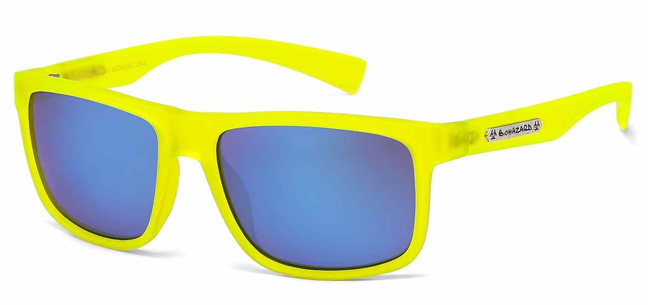 Back in Stock! These Biohazard sunglasses are a fashion style with a cutting edge design. They feature a tiled brick pattern along the edge of the frame and a colorful gradient mirror. They come in a variety of different colors: Black/Pink, Black/Gray, Black/Yellow, Black/Rainbow, Black/Orange, and Black/Green.